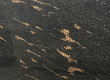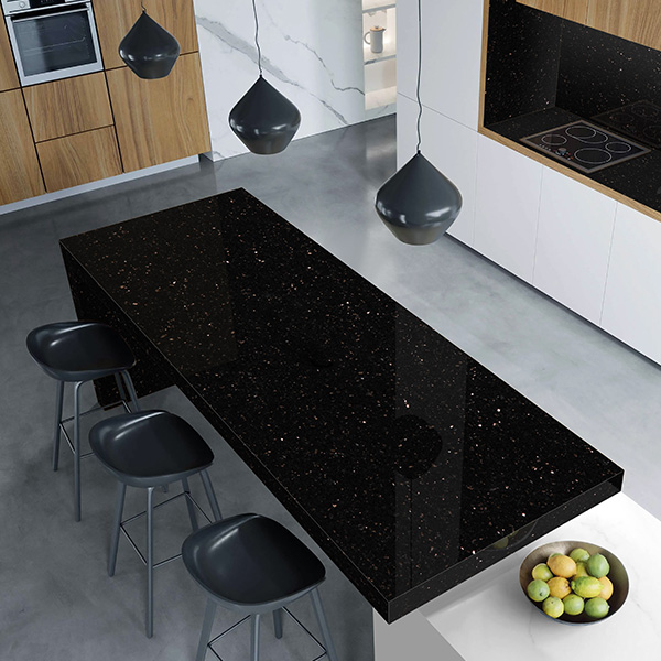 Deep obsidian black with golden speckles... defines the entire kitchen
